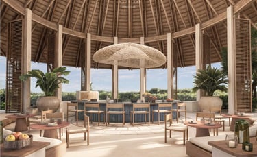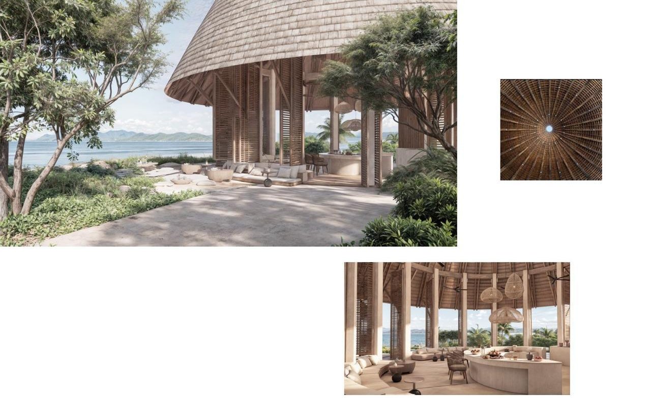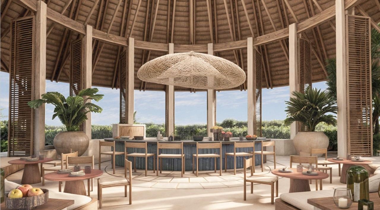 Cada elemento ha sido concebido para fundirse con el entorno: la calidez de la madera, la textura de las fibras naturales y la apertura total hacia el horizonte marino crean un diálogo perfecto entre interior y exterior. El espacio respira el espíritu de comunidad, con un corazón social en torno al bar central, rodeado de zonas de descanso que invitan a la conversación y a la contemplación.