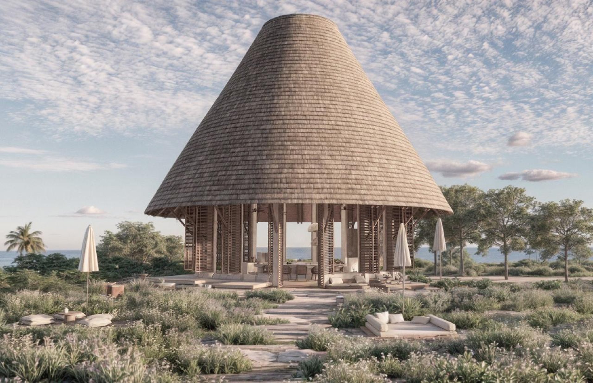 En la costa dorada del Pacífico mexicano, XALA se erige como un ícono de elegancia natural y conexión cultural. Su imponente techo cónico, tejido con precisión artesanal y sostenido por estructuras de madera noble, rinde homenaje a las tradicionales palapas costeras, reinterpretadas con un lenguaje contemporáneo.